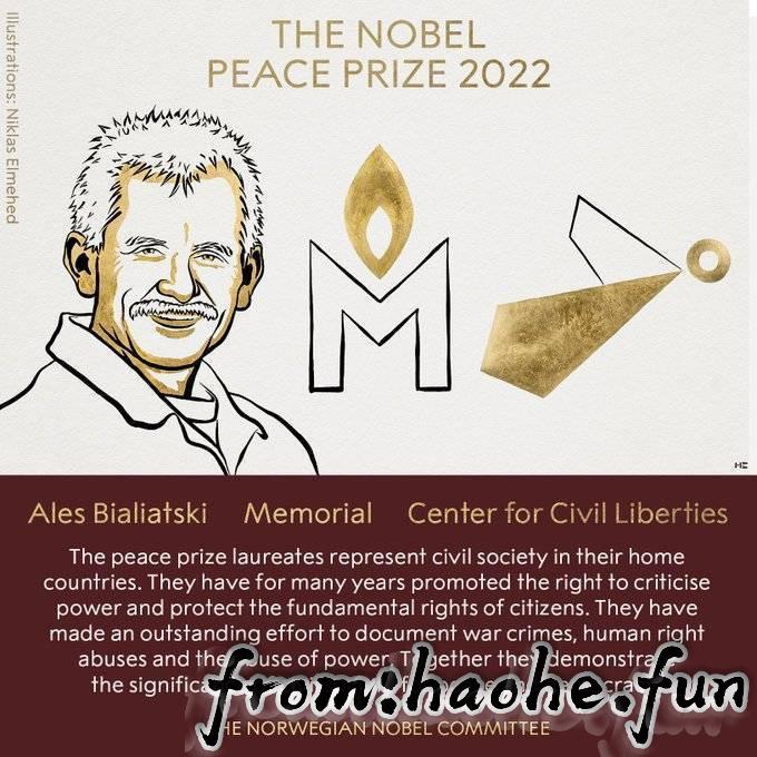 当地时间10月7日,位于奥斯陆的挪威诺贝尔委员会在记者会上宣布,将今年度的诺贝尔和平奖颁给:被监禁的白俄罗斯人权活动人士阿列斯·毕亚利亚茨基(Ales Bialiatski)、俄罗斯人权组织“纪念”(Memorial),以及乌克兰人权组织公民自由中心(Center for Civil Liberties),共一个个人与两个组织。